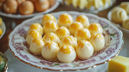 A stunning arrangement of egg desserts showcasing creamy textures and vibrant yellow colors, perfect for a buffet or elegant dining experience.