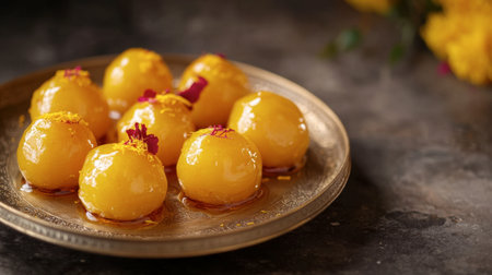 Classic South Asian sweetmeats dipped in saffron syrup, arranged on a brass plate for a festive celebration.