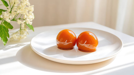 Delight in this exquisite dessert featuring glossy caramel glaze set on a clean white plate, beautifully illuminated by natural light.