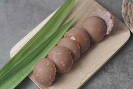Soft and sweet mochi desserts resting on a wooden plate, dusted with powdered sugar and revealing a gooey golden filling. Perfect for any occasion.