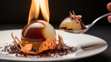 A spoon is being used to eat a dessert with fire, AI