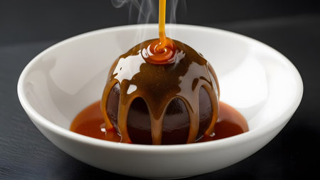 Decadent chocolate dessert with molten caramel sauce elegantly poured over a rich spherical treat