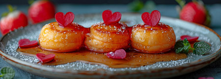 Pancakes with a delicious syrup coating shaped like a heart of love