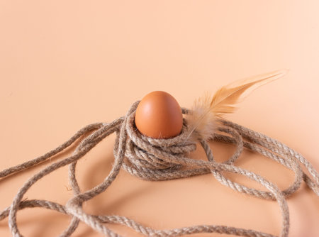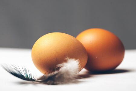 Two brown domestic eggs healthy food and feather laying on white table on gray background closeup studio