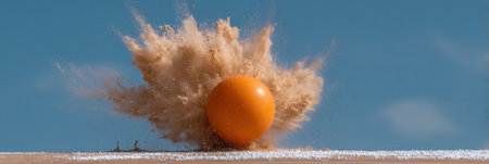 A vibrant balloon bursts suddenly, sending fragments and powder into the air amidst a clear blue sky, capturing a moment of dynamic motion.
