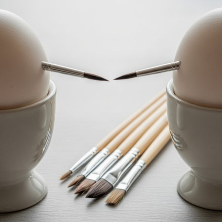 the brushes are laid out in a fan on the table, in the center, around the egg, ready for painting, a blank for the designer.