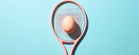 Tennis racket with egg on blue background, creative concept. Surreal art and minimalism idea