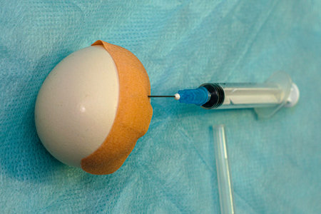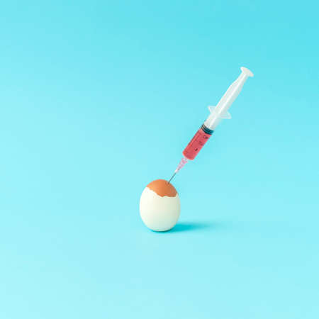 chicken egg sealed with a plaster a syringe is stuck in the plaster concept vaccination pharmaceuticals. High quality photo
