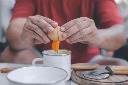 Hands of young Asian man chef cracking eggs into ceramic bowl cooking omelette on wooden board on kitchen table in house. Lifestyle healthy eating and traditional bakery concept.