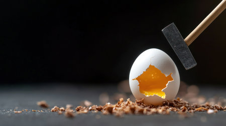 A white egg with a jagged crack revealing a vibrant yellow yolk, positioned below a metal hammer with a wooden handle. Scattered shell fragments.