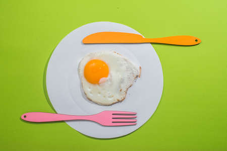 Egg on two forks. Chicken egg stands on two forks. Abstract still life, two forks and egg on a black background.