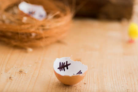 A little yellow toy chicken in an eggshell. On turquoise background.