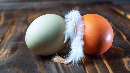 Llight blue and brown eggs with feather. Easter Festival concept. Araucana egg and the egg of an ordinary chicken. Easter egg. Space for text.