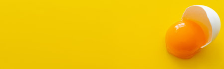 Close up view of organic egg yolk in shell on yellow background with copy space, banner