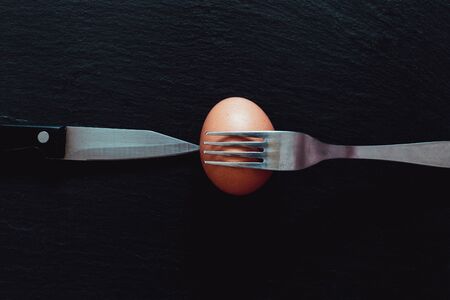 Close-up shot of boiled egg with fork on top and knife on black background – Healthy and organic breakfast with silverware on stone textured surface