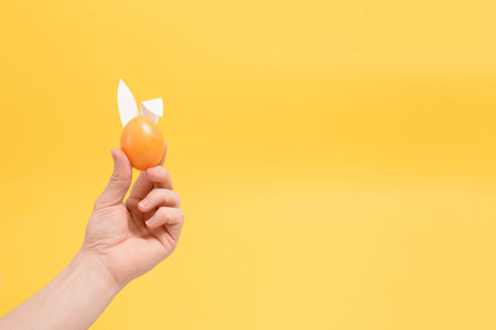 painted colorful eggs in hand with rabbit ears for easter holiday yellow background. background for the poster, place for the text.
