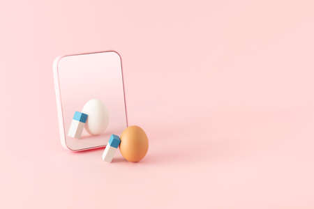 Egg in front of a mirror with eraser on pink background. Creative easter holiday concept.