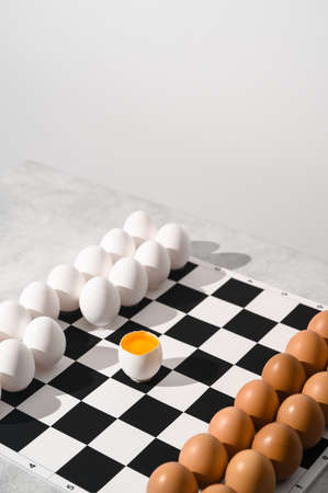 Chessboard with figures of white and brown eggs on a gray background. Creative Idea Easter and chess. Place for text