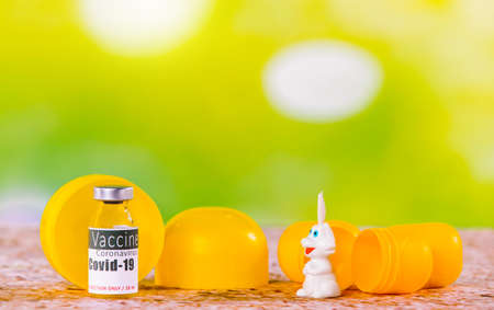 Easter holidays during coronavirus pandemic. Illuminating surprise toy bunny and another an ampoule of covid 19 vaccine on a green background with blank space. Pascal surprise in coronavirus period