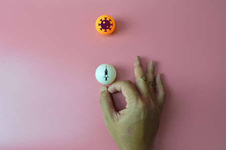 Businessman hand is ready to flick the ball with syringe icon and shoot the ball with covid-19 icon.