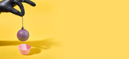 Muffin with bubble ball and chef hand in black gloves. Bold yellow color. Christmas food in contemporary style