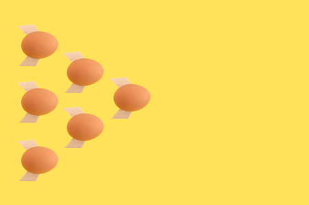 Four eggs on a white and a yellow background, lay flat. Space for the text.