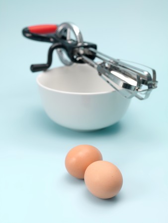 White Eggs in bowl with Egg whisk to prepare breakfast