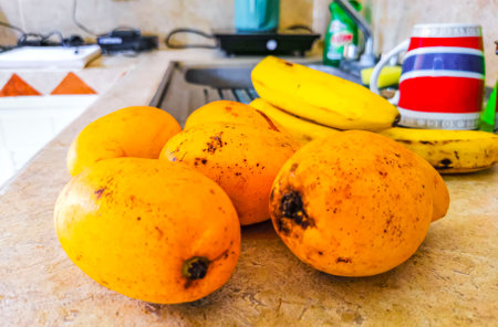 Mangos bananas tomatoes fruits and vegetables on the table for preparing breakfast or lunch in Playa del Carmen Mexico.