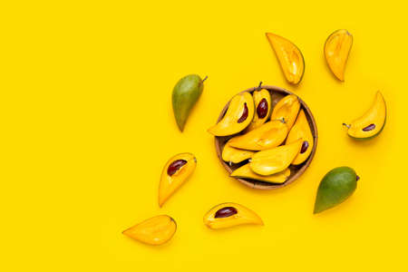 Tropical fruit, Mango on yellow background. Top view