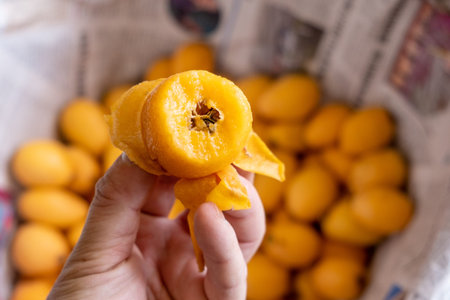 He held the eaten loquat fruit in his hand