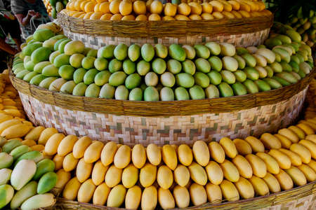 Mango festival. Stand with fresh yellow and green mango fruits in the street market.
