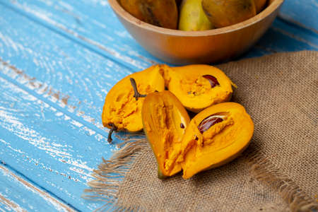Egg fruit Canistel Yellow Sapote (Pouteria campechiana (Kunth) Baehni) on blue wooden table