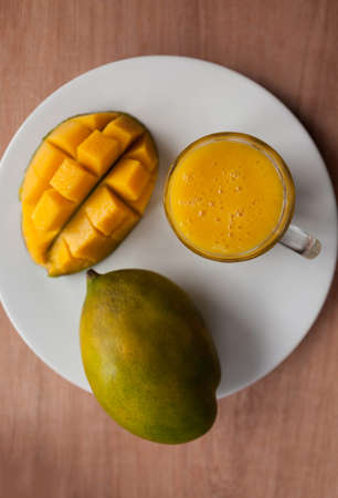 Top view of fresh mango smoothie with ripe mangoes on the white plate