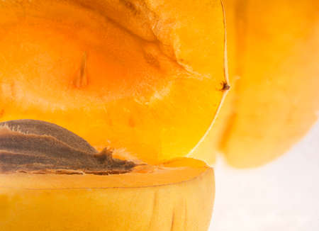 A view of a brown stone inside a cut yellow apricot. close-up. Macro