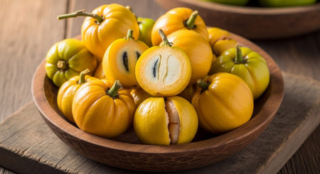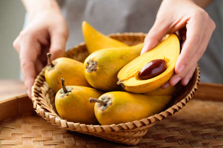 Eggfruit or canistel in a bamboo tray on wooden table, Thai fruit, In Thai names such as Xiantao, Lamut Khamen or Mon khai