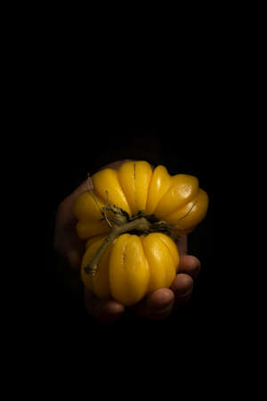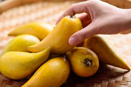 Eggfruit or canistel in a basket holding by hand, Thai fruit, In Thai names such as Xiantao, Lamut Khamen or Mon khai