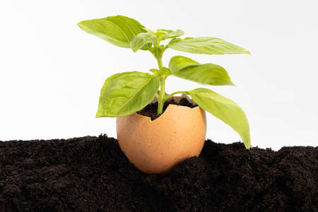 A green sprout grows from an eggshell. The concept of growth and development. Light background.