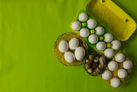 White chicken Chicken and quail eggs in colored paper eco-friendly packaging with decorative sisal.
