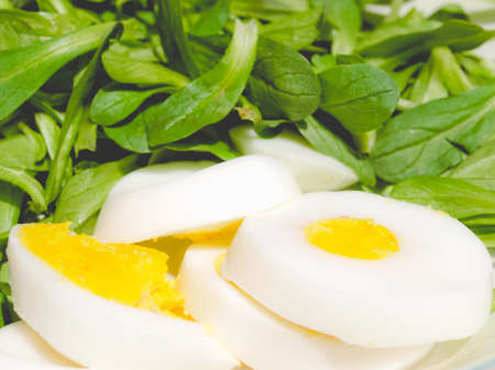 Green egg and the usual in wooden bowl on wooden background.Top view.