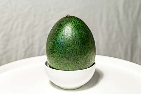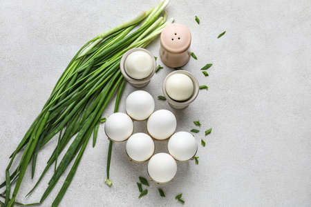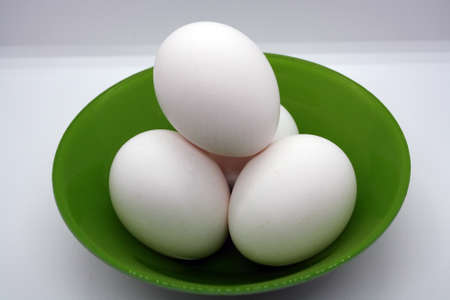 organic white eggs in a dark gray bowl on a white green surface with copy space for text