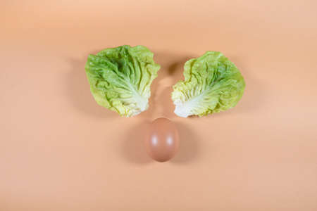Minimal abstract modern composition of Easter eggs and vegetables on orange background, representing Easter rabbit. Lettuce leaves representing bunny ears.