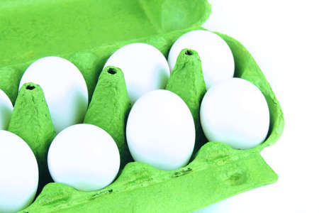 open egg box. chicken eggs in a green cardboard box on a white background, copy space