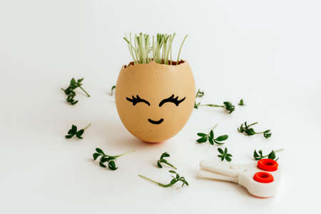 a successful haircut and happiness from changing the image. Brown chicken egg with seedlings inside and out. An emotional cute face is drawn on the shell.