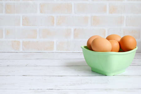 Selective focus of an eggs on a green bowl on a wooden background. Copy space for text or logo.