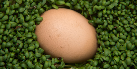 young fresh greens in a egg shell. seed sprouting. concept of awakening nature and waste-free farming.