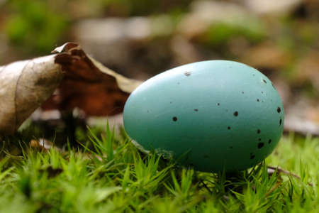 A blue polka dot thrush egg lies on moss in forest. The thrushes sometimes lay their eggs outside the nest.