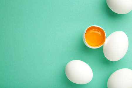 Easter decoration white eggs on mint background, minimal design with space for text. Top view