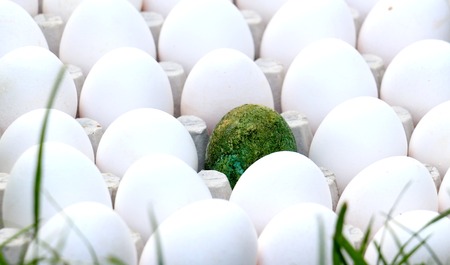 Chicken eggs in a cardboard container. One egg out of ten is colored green