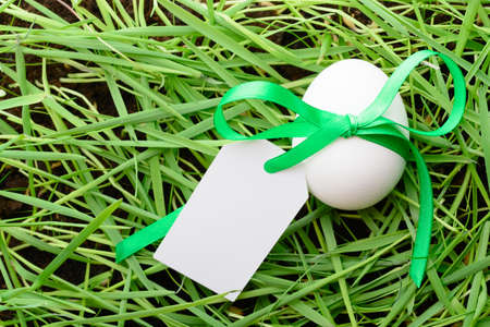 Diagonal pass card with painted egg, monochrome, macro photography, copy space