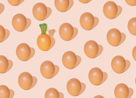 Creative Easter pattern of eggs and carrots. A simple, minimal idea for Easter with a pastel tone.